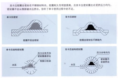 双卡压式胶圈密封在91短视频网站材料内,胶圈耐久性明显提高,且双卡压密封圈左右受挤压均匀,密封圈不会从侧面倍水压挤出,弥补了单卡压适用过程中的不足。